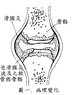 類風濕性關節炎主要的病理變化是所謂的「滑膜炎」。正常狀況下,關節腔內面有一層精緻的滑膜,可分泌關節滑液,以潤淜和保護關節。罹患類風濕性關節炎時,滑膜產生發炎反應,關節因發炎細胞的聚積而有紅、腫、熱、痛的現象。這種發炎反應嚴重時甚至侵犯整個關節,破壞軟骨甚至骨骼。若缺乏適當治療,關節終將變形、僵直而無法活動。(圖片一)