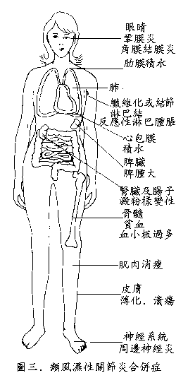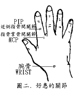 stiffness); 睡眠、休息許久之後要感到腫脹而僵硬,稍一使力即怠不適,顯示出關節正受發炎反應所侵犯,漸漸產生腫、熱、痛。最常出現的部位是手指近端、手指和手掌間,手腕;足部的腳趾和腳掌之間等部位;膝、腳踝、肩關節及其他部位的關節也可能受侵犯,但較少見。此外,侵犯的部位常有「對稱」的情形,即在身體左右兩側同一部位都出現症狀。(圖片二)