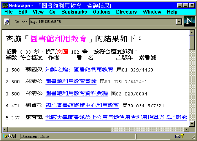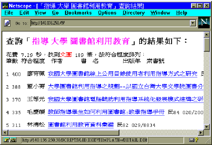 從使用者檢索的記錄檔中,我們選擇:「圖書館利用教育」此項條件重作查詢,其部份檢索結果如下: