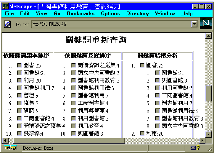 [9, 15],讀者可根據查詢結果的符合程度,來判斷排列在後面的資料是不是還有參考的價值,以節省檢視查詢結果的時間。此種查詢方式對不諳查詢技巧的使用者而言極為便利,想到什麼詞句,就輸入什麼字串,而不用關心應該要用